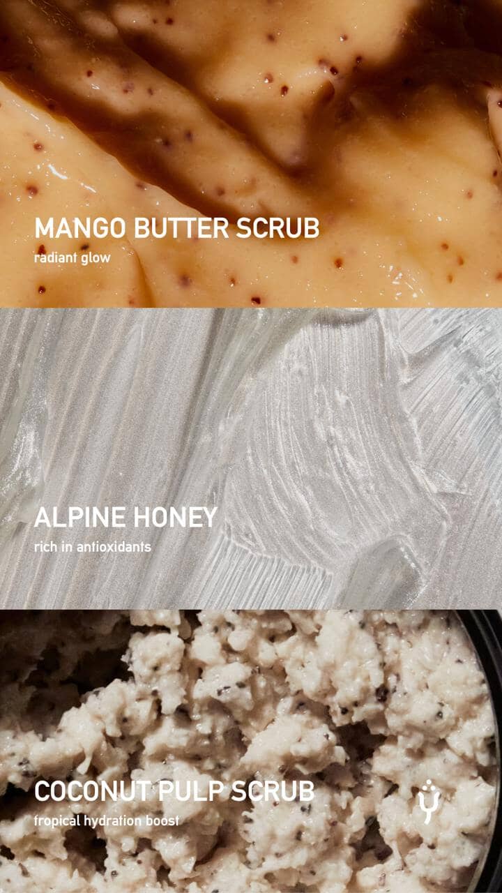 Mango: Aqua (Water), Cellulose Acetate, Glycerin, Caprylic/Capric Triglyceride, Sodium Acrylate/Sodium Acryloyldimethyl Taurate Copolymer, Polyisobutene, Helianthus Annuus (Sunflower) Seed Oil, Argania Spinosa Shell Powder, Sucrose, Benzyl Alcohol, Parfum (Fragrance), Propylene Glycol Dipelargonate, Xanthan Gum, Caprylyl/Capryl Glucoside, Sorbitan Oleate, Sucrose Laurate, Mangifera Indica (Mango) Seed Butter, Dehydroacetic Acid, Sucrose Stearate, Citric Acid, Geraniol, Linalool, Tocopheryl Acetate, Limonene, Citronellol, Citrus Aurantium Peel Oil, Hexyl Cinnamal, CI 15985 (Yellow 6), Sodium Hydroxide.